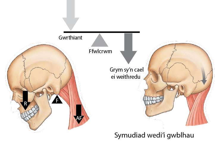 Mae’r math hwn o lifer i’w gael yn y gwddf pan fyddwch yn nodio eich pen i benio pêl-droed. Cyhyrau’r gwddf sy’n darparu’r ymdrech, y gwddf yw’r ffwlcrwm a phwysau’r pen yw’r llwyth.