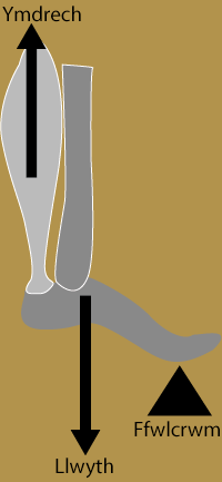 echelin saethol – mae hon yn mynd o’r blaen i gefn y corff, er enghraifft, pan fydd person yn cyflawni olwyn dro.