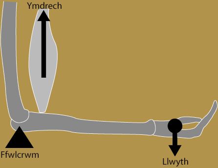 Yn ystod cyrliad cyhyryn deuben, y ffwlcrwm yw cymal y penelin, mae’r ymdrech yn dod o’r cyhyryn deuben yn cyfangu a’r gwrthiant yw pwysau’r elin ac unrhyw bwysau mae hi’n eu dal.