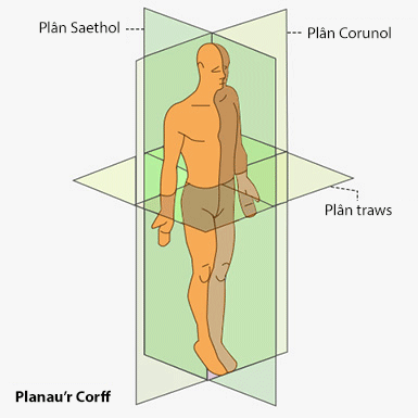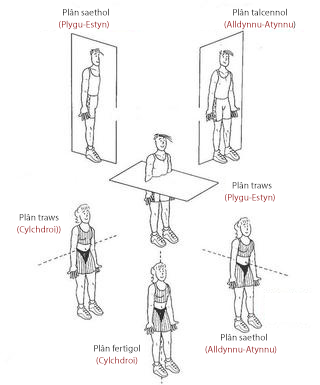 Mae holl symudiadau’r corff yn digwydd mewn gwahanol blanau ac o amgylch gwahanol echelinau: